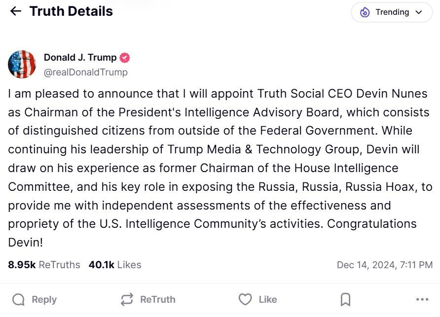 Новоизбранный президент США Дональд Трамп назначит главой консультативного совета по разведке генерального директора своей соцсети Truth Social Девина Нуньеса. Об этом американский политик написал 14 декабря в своей соцсети.