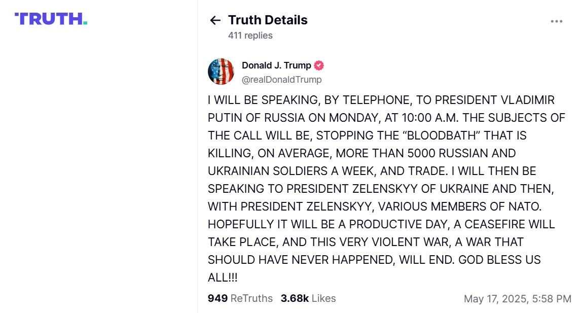 17 мая президент Соединенных Штатов Дональд Трамп сообщил в своей соцсети Truth Social, что утром 19 мая позвонит нелегитимному президенту страны-агрессора России Владимиру Путину.