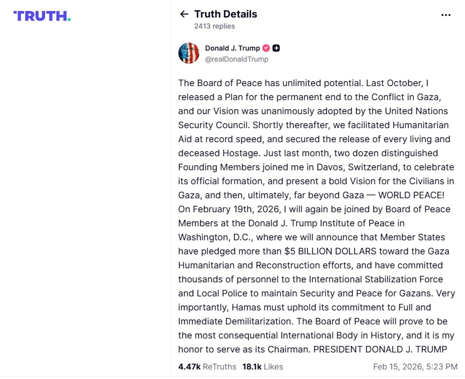 "Всего месяц назад 20 уважаемых членов-учредителей присоединились ко мне в Давосе (Швейцария), чтобы отметить официальное создание Совета. [...] 19 февраля 2026 года я снова соберусь с членами Совета мира в Институте мира имени Дональда Трампа в Вашингтоне", – написал он.