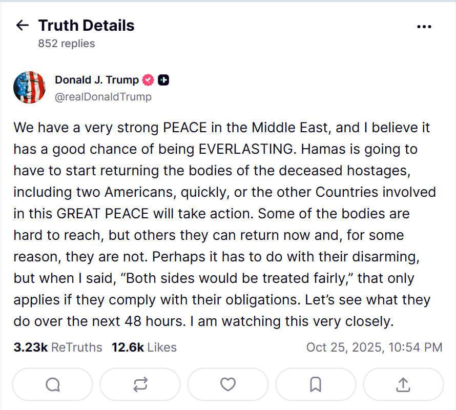 Президент США Дональд Трамп 25 октября установил новый дедлайн для палестинской группировки ХАМАС по возвращению тел заложников. Об этом он написал в социальной сети Truth Social.