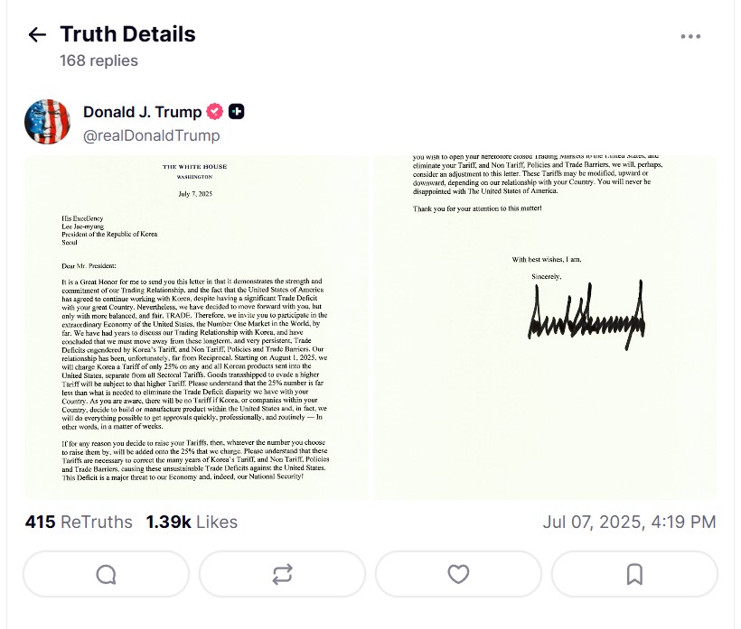 Согласно опубликованным документам, с 1 августа Япония и Южная Корея столкнутся с 25-процентными пошлинами, а если же те решат повысить свои пошлины на американские товары, Вашингтон повысит свои еще на 25%.