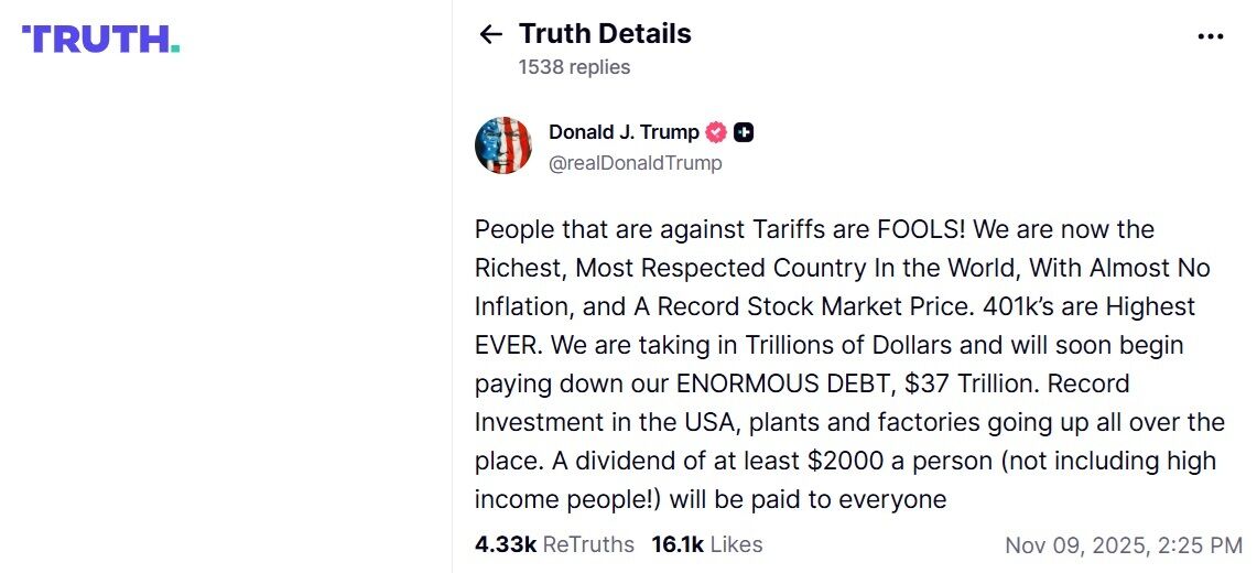 9 ноября президент США Дональд Трамп заявил в своей соцсети Truth Social, что почти все американцы получат по $2 тыс. за счет доходов от пошлин.