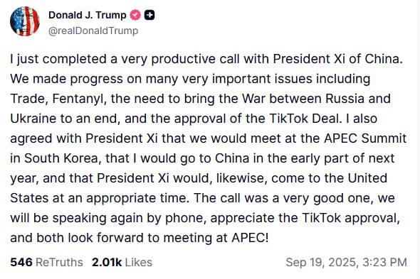 "Разговор был очень полезным, мы еще поговорим по телефону, признателен за одобрение TikTok, и оба с нетерпением ждем встречи на АТЭС!" – написал президент США.