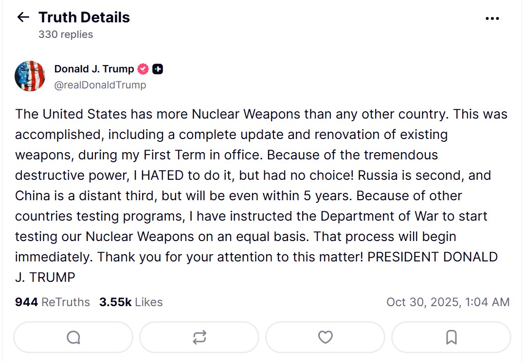 "[Страна-агрессор] Россия – на втором месте, а Китай значительно отстает, но сравняется в течение пяти лет. Из-за программ испытаний других стран я поручил министерству войны начать испытания нашего ядерного оружия на равных условиях. Этот процесс начнется немедленно", – написал глава Белого дома.