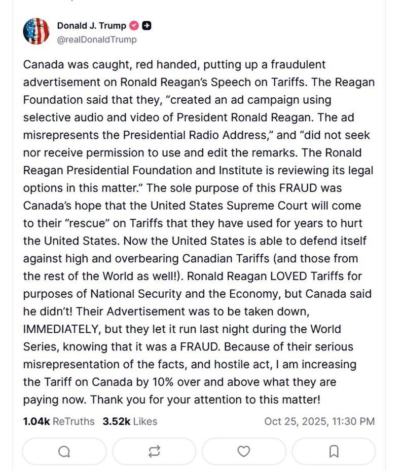 "Единственной целью этого мошенничества была надежда Канады на то, что Верховный суд США придет ей на "помощь" в отношении пошлин, которые она использовала в течение многих лет, чтобы нанести ущерб Соединенным Штатам. [...] Рейган любил пошлины – из соображений национальной безопасности и экономики, но Канада заявила, что он их не любил! Их рекламу должны были снять немедленно, но они позволили ей выйти в эфир вчера вечером во время Мировой серии, зная, что это мошенничество. Из-за их серьезного извращения фактов и враждебного акта я повышаю пошлины на Канаду еще на 10% сверх того, что они платят сейчас", – добавил Трамп.