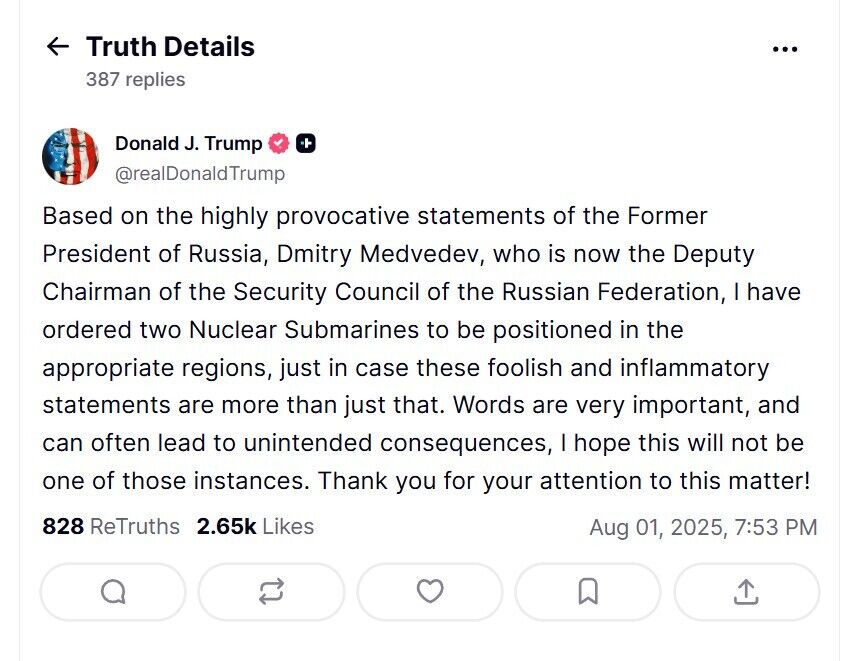 Соединенные Штаты Америки переместят две атомные подводные лодки в ответ на заявления заместителя главы Совета безопасности страны-агрессора РФ, экс-президента Дмитрия Медведева. Об этом 1 августа в своей соцсети Truth Social написал президент США Дональд Трамп.