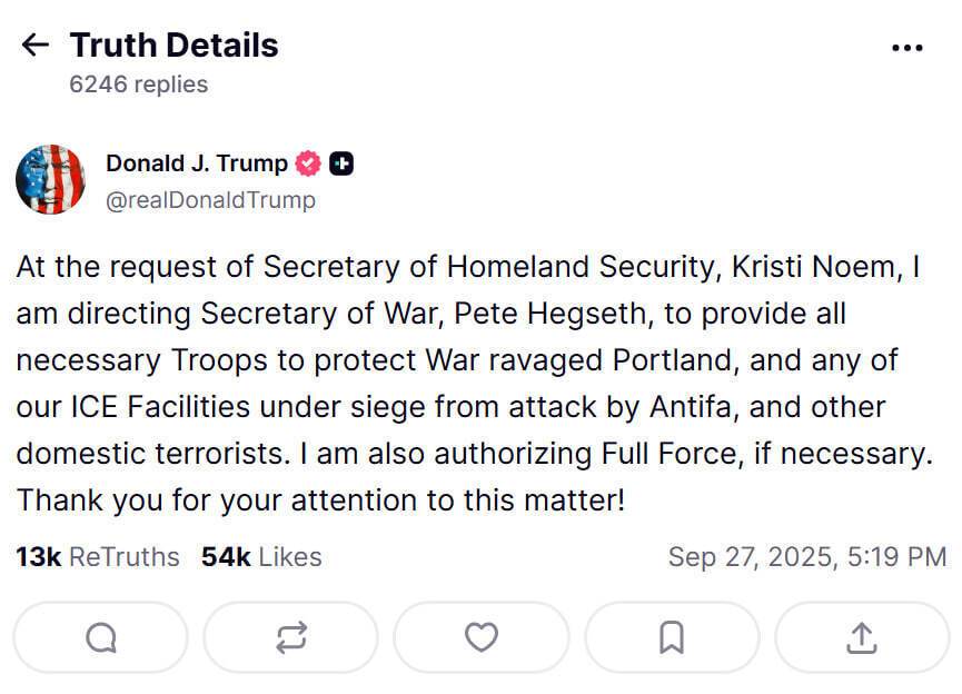 "По просьбе министра внутренней безопасности Кристи Ноем я приказываю министру войны Питу Хегсету предоставить все необходимые войска для защиты разрушенного войной Портленда и любых наших объектов [иммиграционной и таможенной службы США] ICE, находящихся в осаде из-за нападений со стороны [леворадикального движения] "Антифа" и других внутренних террористов", – заявил Трамп.