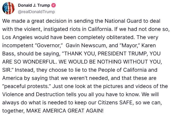 "Мы приняли правильное решение, направив Национальную гвардию для подавления насильственных, спровоцированных беспорядков в Калифорнии. Если бы мы этого не сделали, Лос-Анджелес был бы полностью уничтожен", – считает Трамп.
