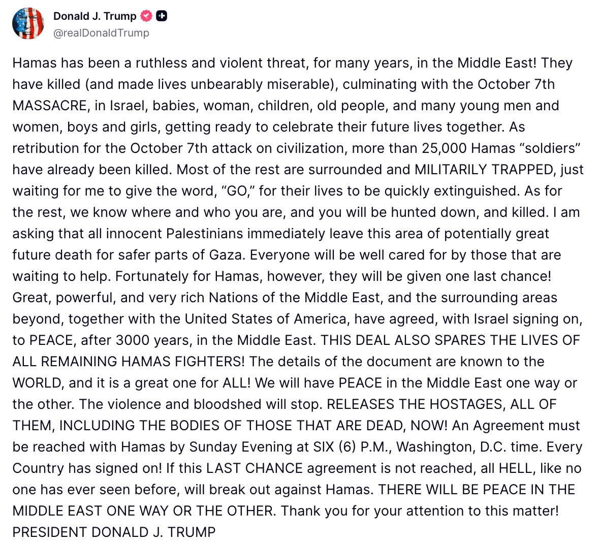 "Соглашение с ХАМАС должно быть достигнуто к воскресному вечеру в 18.00 по вашингтонскому времени [1.00 6 октября по киевскому времени]. Каждая страна подписала соглашение! Если это соглашение последнего шанса не будет достигнуто, против ХАМАС начнется настоящий ад, которого никто раньше не видел. На Ближнем Востоке будет мир так или иначе", – подчеркнул Трамп.