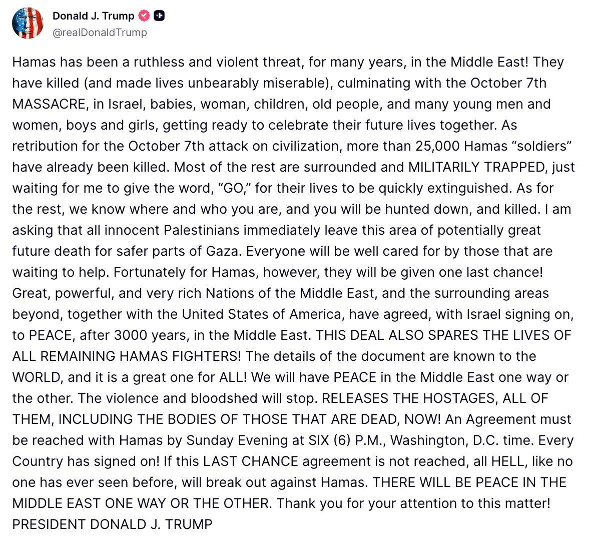 В сообщении он упомянул нападение ХАМАС 7 октября 2023 года, отметив, что возмездием за него стали убийства более 25 тыс. боевиков группировки. Остальные, по словам главы Белого дома, находятся в "военной ловушке", и ему стоит только дать команду, "чтобы их жизни быстро угасли".