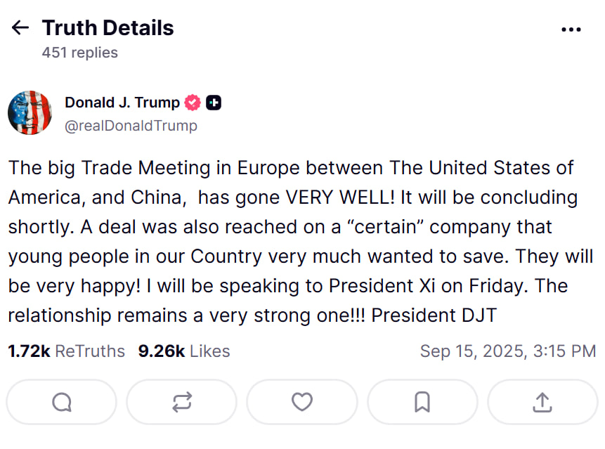 "Большая торговая встреча в Европе между Соединенными Штатами Америки и Китаем прошла очень хорошо! Она скоро завершится. Также было достигнуто соглашение по "определенной" компании, которую молодежь в нашей стране очень хотела спасти. Они будут очень счастливы!" – написал Трамп.