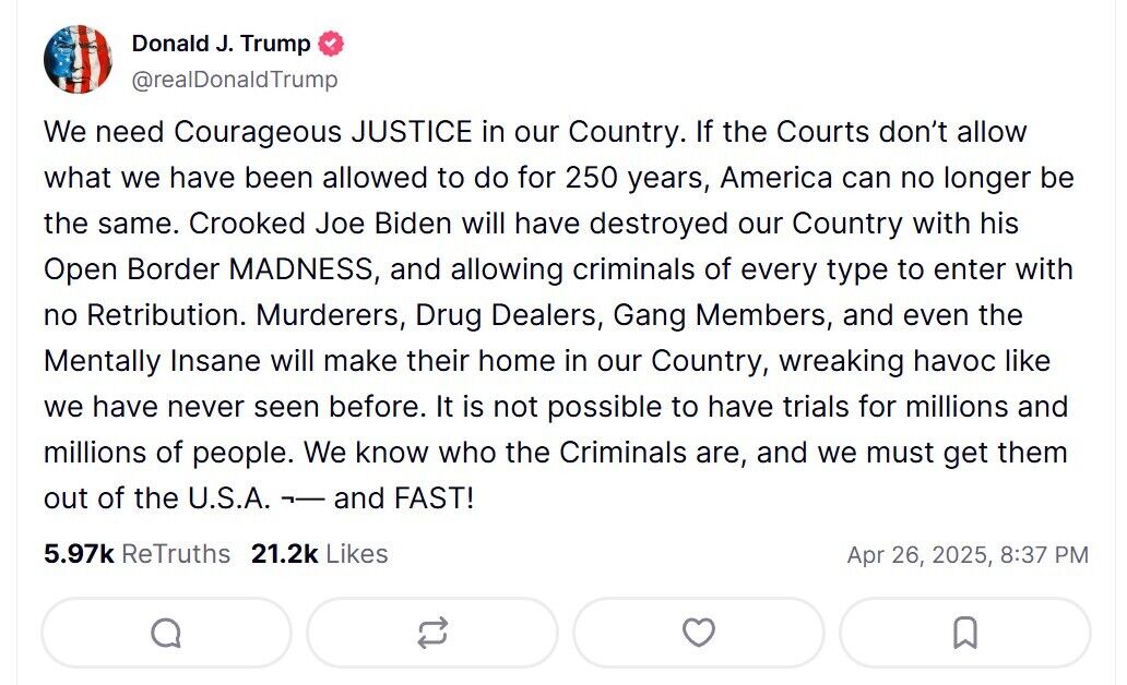 Президент США Дональд Трамп заявил 26 апреля в своей соцсети Trurh Social, что Америке нужно "смелое правосудие" для проведения миграционной политики.