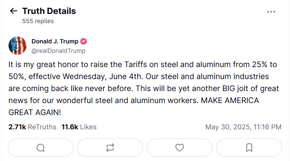 В своем обращении 30 мая на заводе US Steel недалеко от Питтсбурга (штат Пенсильвания), который транслировал Белый дом в YouTube, Трамп сказал, что хотел повысить тарифы до 40%, однако руководители отрасли заявили ему, что хотят ввести тариф в размере 50%.
