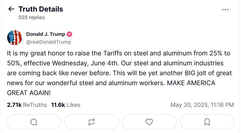 Президент США Дональд Трамп объявил повышение тарифов на импорт стали и алюминия с 25% до 50%. Об этом он написал 30 мая в своей соцсети Truth Social.