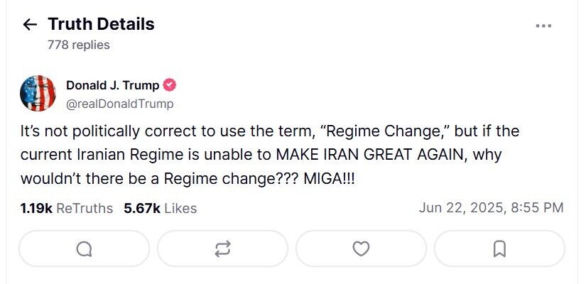 Президент США Дональд Трамп выступил за смену режима власти в Иране. Соответствующее сообщение он сделал 22 июня в своей соцсети Truth Social.