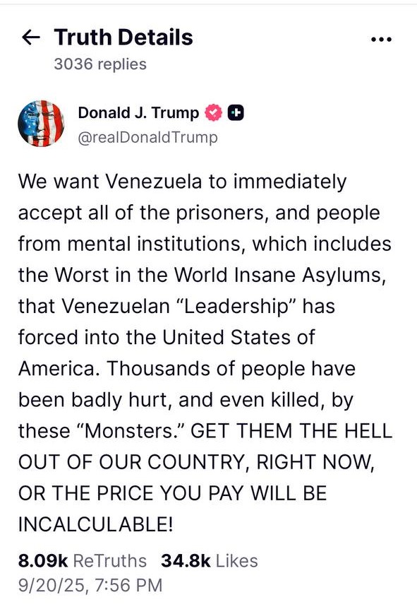 "Мы хотим, чтобы Венесуэла немедленно приняла всех заключенных и людей из психиатрических заведений, среди которых есть худшие сумасшедшие мира, которых венесуэльское "руководство" принудительно отправило в Соединенные Штаты Америки", – написал Трамп.
