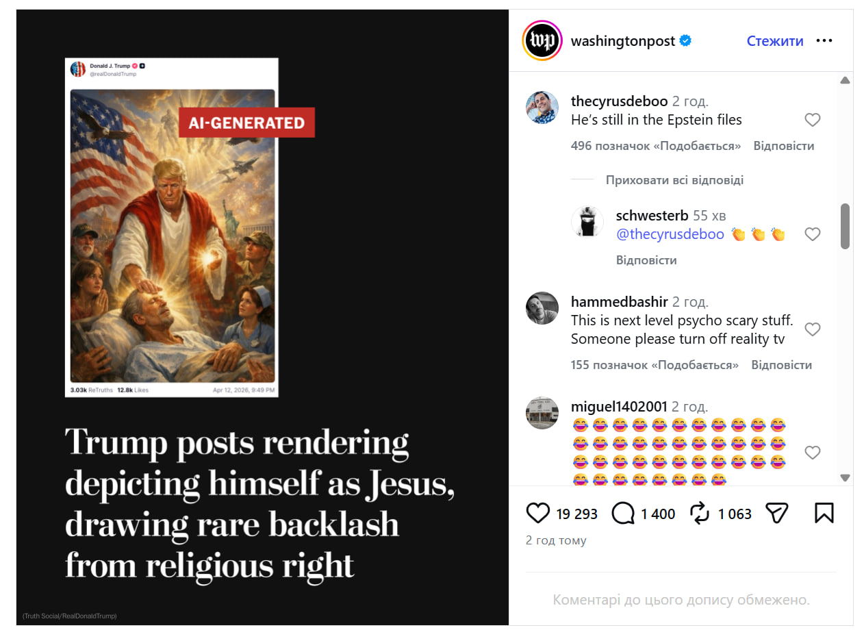 Пользователи Instagram в комментариях упоминали вероятные связи Трампа с покойным скандальным финансистом Джефри Эпштейном, осужденным за сексуальные преступления, называли сообщение "психопатическими страшилками следующего уровня" и просили выключить это "реалити-шоу".