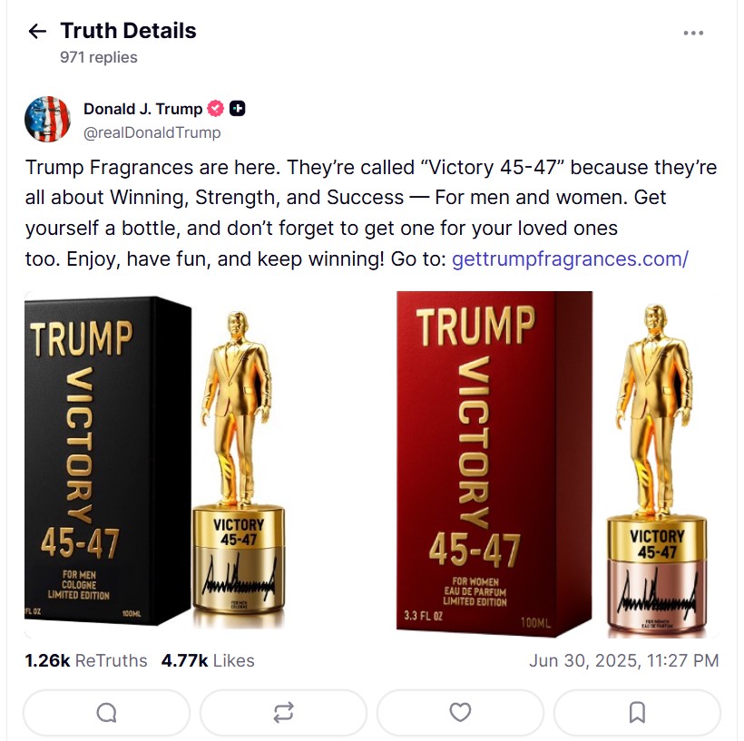 "Они называются Victory 45-47, потому что они о победе, силе и успехе – для мужчин и женщин. Купите себе флакон и не забудьте купить еще один для своих любимых. Наслаждайтесь, веселитесь и продолжайте побеждать!" – написал глава Белого дома.