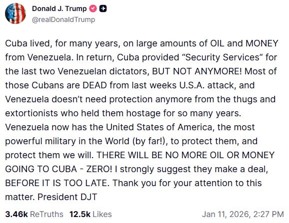 "Взамен Куба предоставляла "услуги безопасности" двум последним венесуэльским диктаторам, но больше этого нет! Большинство этих кубинцев погибли в результате атаки США на прошлой неделе, и Венесуэле больше не нужна защита со стороны бандитов и вымогателей, которые держали ее в заложниках столько лет", – написал президент США.