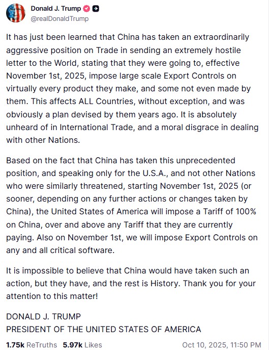 "Только что стало известно, что Китай занял чрезвычайно агрессивную позицию в вопросах торговли, направив миру крайне враждебное письмо, в котором заявил, что с 1 ноября 2025 года он намеревается ввести масштабный экспортный контроль практически на все производимые им товары, а также на некоторые товары, которые он даже не производит", – подчеркнул Трамп.