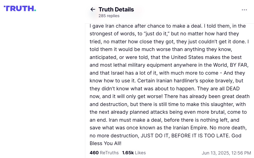 "Следующие, уже запланированные атаки будут еще более жестокими. Иран должен заключить сделку, пока ничего не осталось, и спасти то, что когда-то было известно как Иранская империя. Больше никаких смертей, никаких разрушений. Просто сделайте это, пока не стало слишком поздно", – призвал Трамп.
