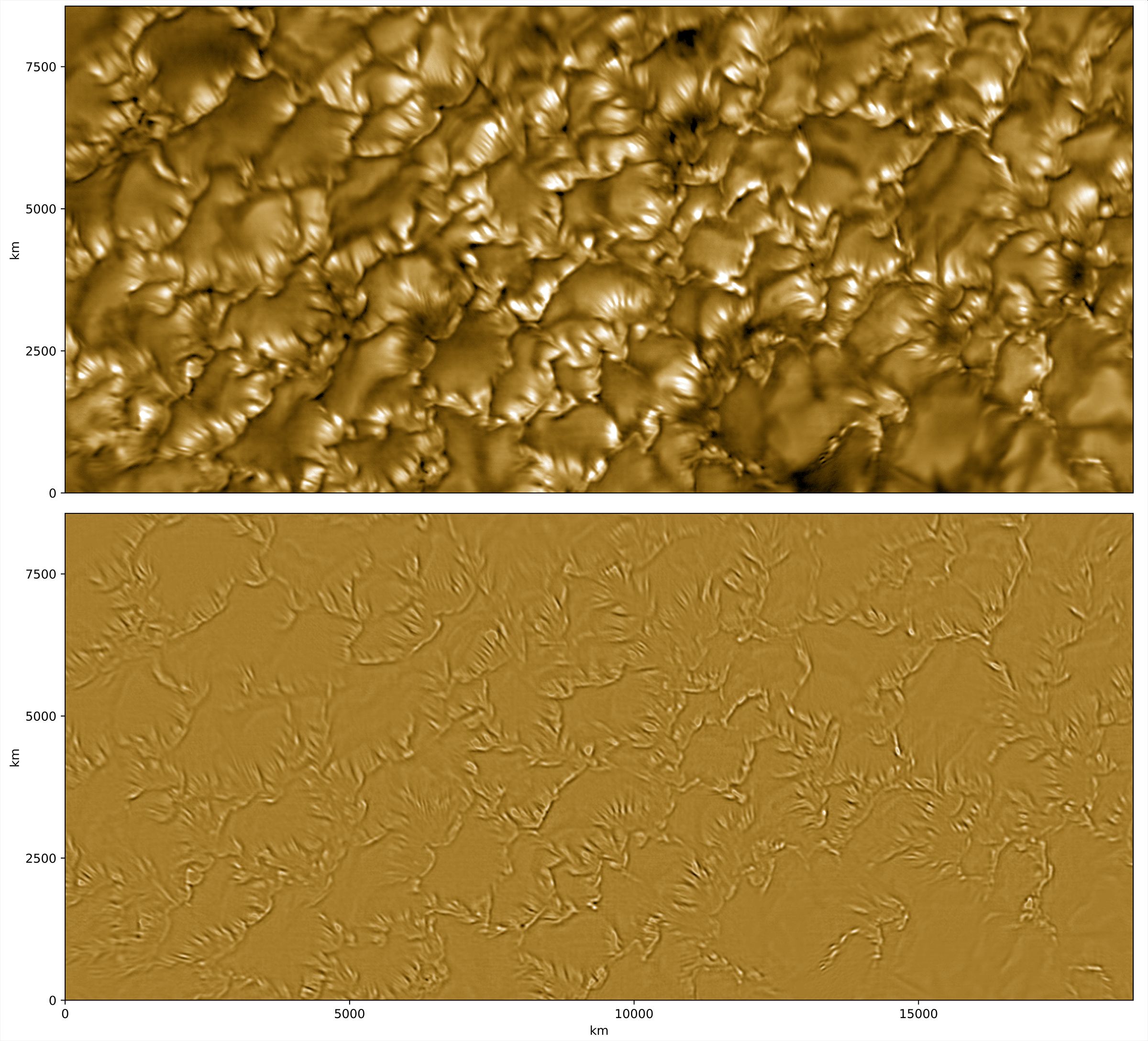 На фото видны магнитные полосы на поверхности Солнца. Они имеют ширину всего около 20 км. Используя специализированную камеру Visible Broadband Imager и G-band, который выделяет магнитную активность на небесном теле, солнечный телескоп Inouye смог запечатлеть мельчайшие детали этих магнитных полос. Разрешение фотографии настолько четкое, что теперь ученые могут наблюдать магнитные узоры на поверхности Солнца во всех деталях.