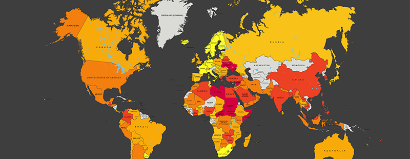 Украина оказалась в группе стран "5+", отмеченных на карте темно-красным цветом. Компанию ей составили Ливия, Судан, Южный Судан, Сирия, Сомали, Палестина, Центральноафриканская Республика.