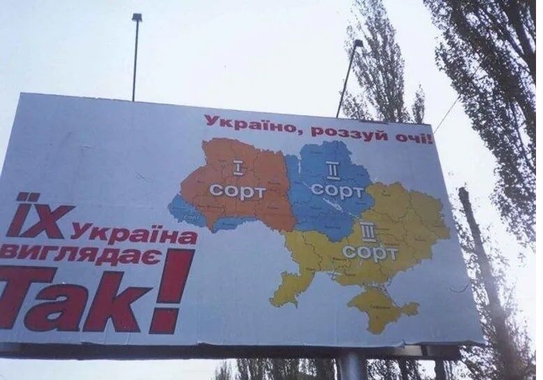 Цветами и лозунгами визуализация тезиса о "трех сортах" украинцев мимикрировала под стиль рекламы блока Виктора Ющенко "Наша Украина" и была направлена на межрегиональный раскол, отметил "24 канал".