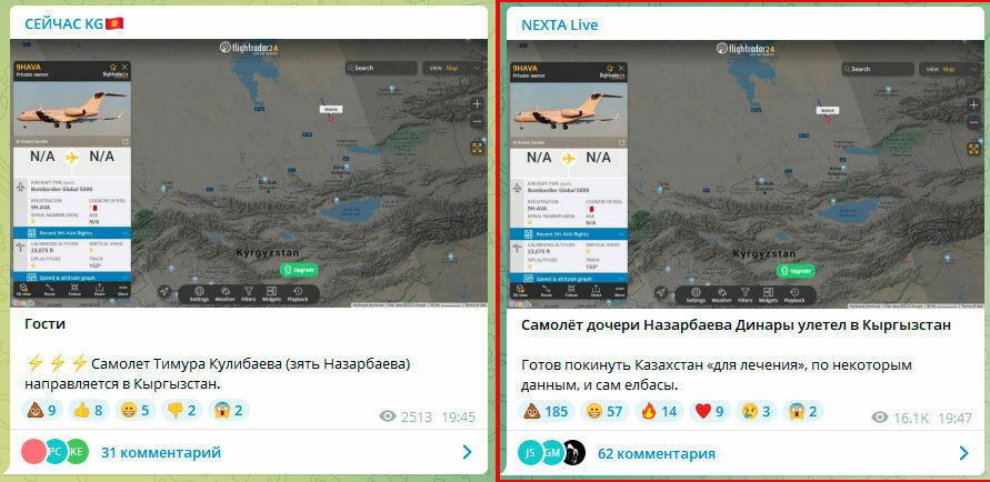Агентство писало, что Telegram-каналы публиковали скриншоты с маршрутом рейса 9H-AVA и сообщениями, что этот самолет направляется в Кыргызстан и принадлежит, по разным данным, средней дочери Назарбаева Динаре или ее мужу Тимуру Кулибаеву.