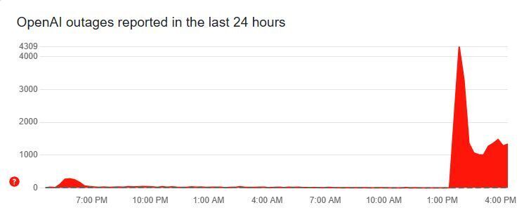 В работе чат-бота ChatGPT 23 января произошел масштабный сбой. Пользователи массово жалуются, что сервис не отвечает на запросы, свидетельствуют данные сервиса Downdetector, который мониторит работу разных платформ и мессенджеров.