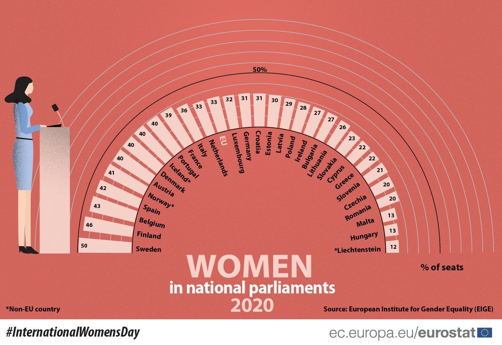В 2020 году Финляндия имела самую высокую долю женщин-членов в правительстве (55%). За Финляндией следуют Австрия (53%), Швеция (52%), Франция (51%) и Бельгия (50%). Самые низкие показатели были зарегистрированы на Мальте (8%), Греции (11%) и Эстонии (13%).