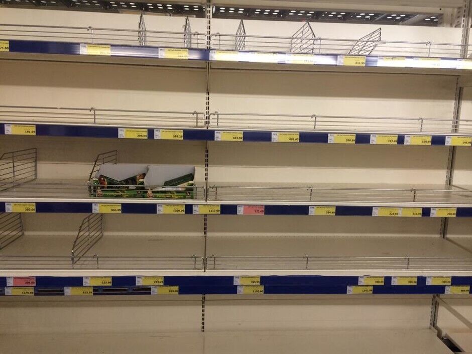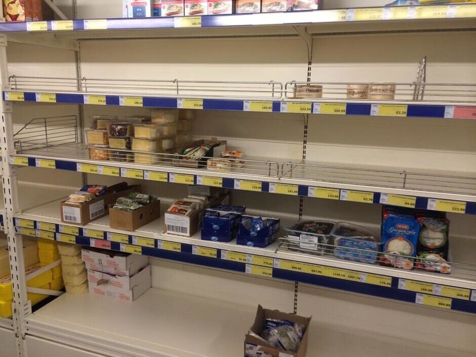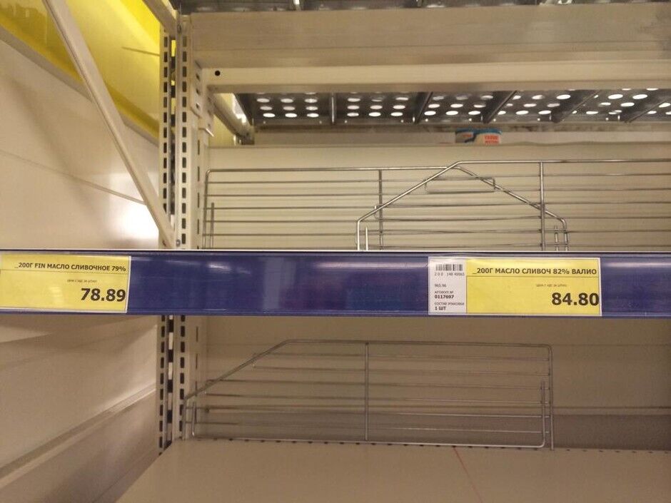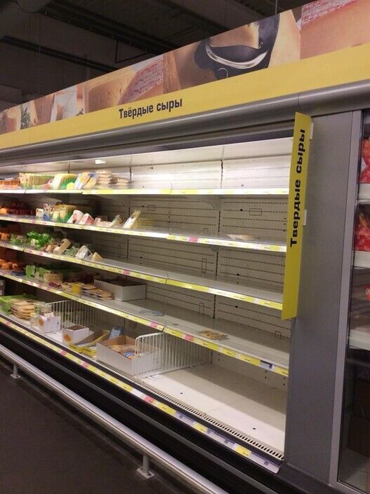 Российский фотограф Антон Белицкий выложил в Facebook фото пустых полок московского магазина "Метро". По его словам, москвичи раскупили сыры, творог и масло. "Не верил, пока сам не увидел", – написал Белицкий. В прошлые выходные подобная картина наблюдалась и в одном из московских супермаркетов сети "Зеленый Перекресток". По информации блогеров, в магазине не было не только молочной продукции, но даже мяса и рыбы. В супермаркетах говорят, что у них поломались холодильники, но пользователи соцсетей связывают пустые полки с введенными на прошлой неделе Россией санкциями в отношении стран ЕС, США, Канады, Австралии и Норвегии. Под запрет, в частности, попали импортные мясо, рыба, молочные продукты, овощи и фрукты.