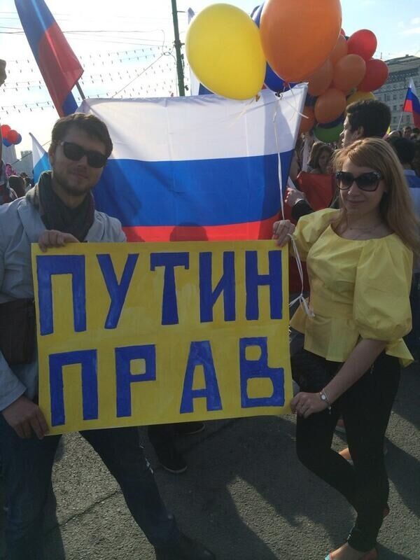 Участники первомайского шествия в Москве держат плакаты "Славянск, Донецк, Луганск – мы с вами", "Юго-восток Украины, мы своих не бросаем".