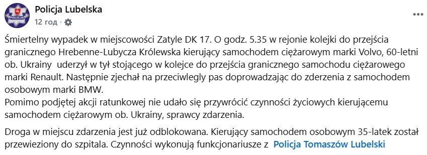 25 октября в Польше недалеко от границы с Украиной в ДТП погиб гражданин Украины, управлявший грузовиком. Об этом проинформировала в Facebook полиция Люблинского воеводства Польши.