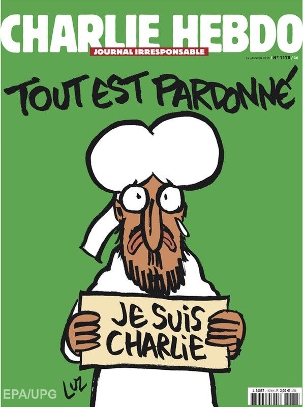 На обложке газеты рядом с надписью "Все прощено" изображен пророк Мухаммед со слезой, который держит в руках плакат "Я Шарли".