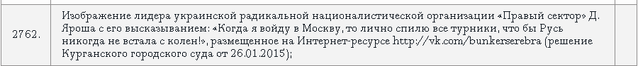 "Изображение лидера украинской радикальной националистической организации "Правый сектор" Дмитрия Яроша с его высказыванием: "Когда я войду в Москву, то лично спилю все турники, чтобы Русь никогда не встала с колен!", размещенное на интернет-ресурсе http://vk.com/bunkerserebra (решение Курганского городского суда от 26.01.2015)", – сказано в сообщении.