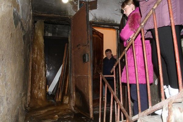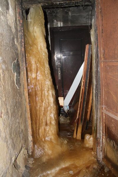 "Глобус" пишет, что сосулька ежедневно увеличивалась, а из-за наступившей в последние дни оттепели она начала подтаивать. Стаявшая жидкость разливается зловонной лужей по первому этажу и проникает в соседний жилой блок.