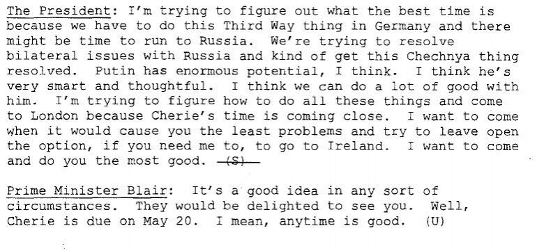 В США опубликовали 523 страницы стенограмм телефонных разговоров экс-президента США Билла Клинтона и экс-премьер-министра Великобритании Тони Блэра в период с 1 мая 1997 года по 13 декабря 2000 года. В своих беседах они упоминали и нового президента России Владимира Путина.
