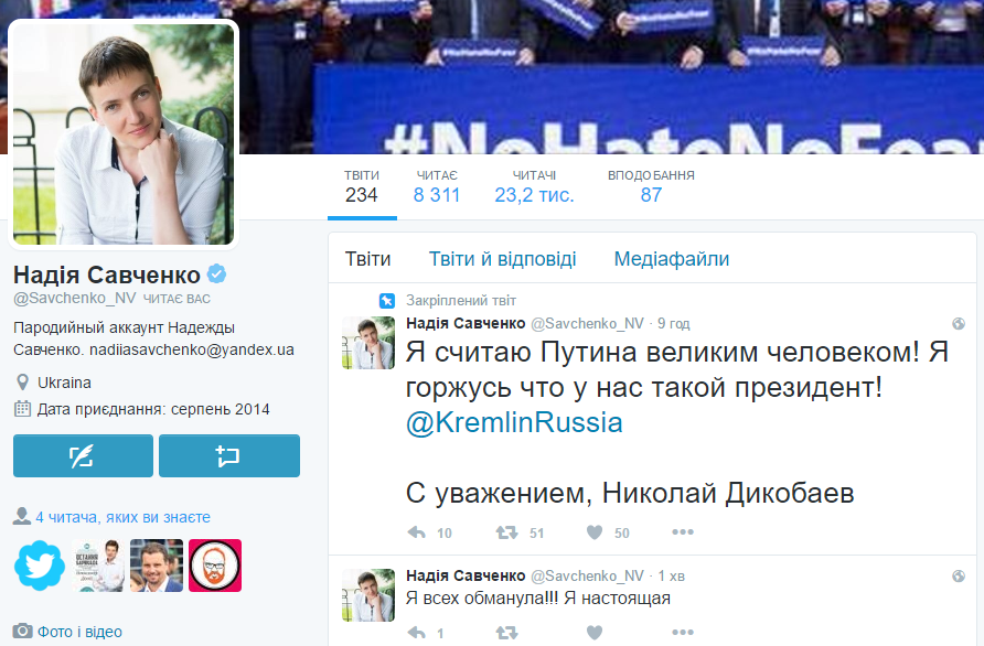Фейковый аккаунт нардепа Надежды Савченко, созданный россиянином Николаем Дикобаевым, получил верификацию от администрации Twitter. Позже в статусе появилось уточнение, что это – "пародийный аккаунт".
