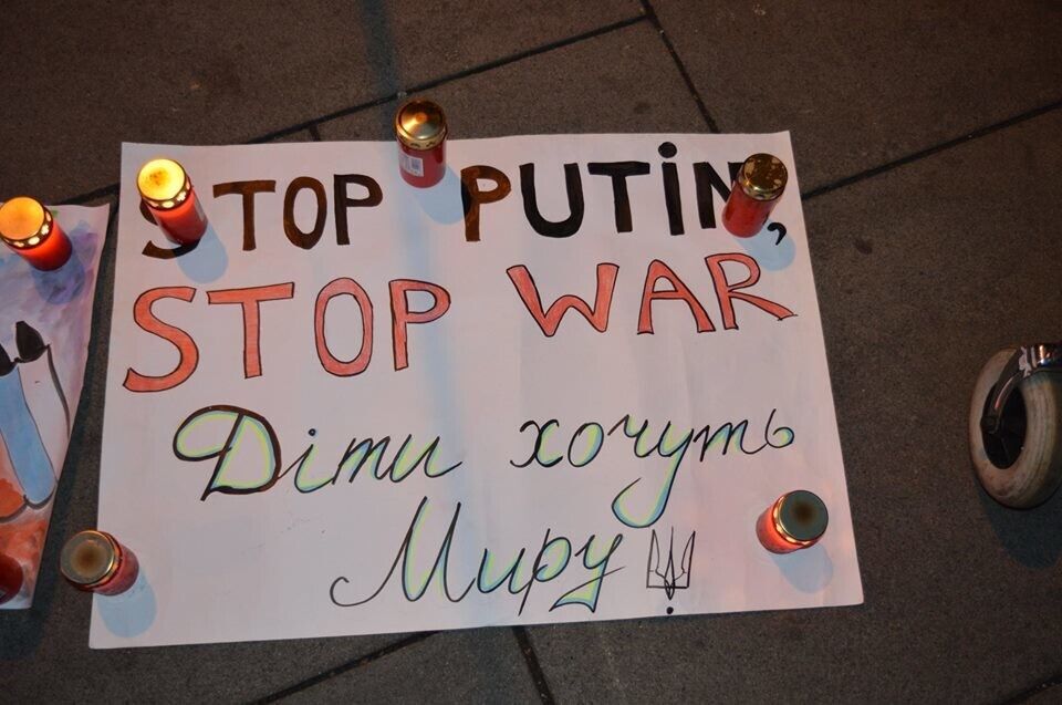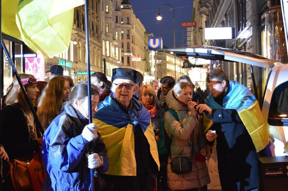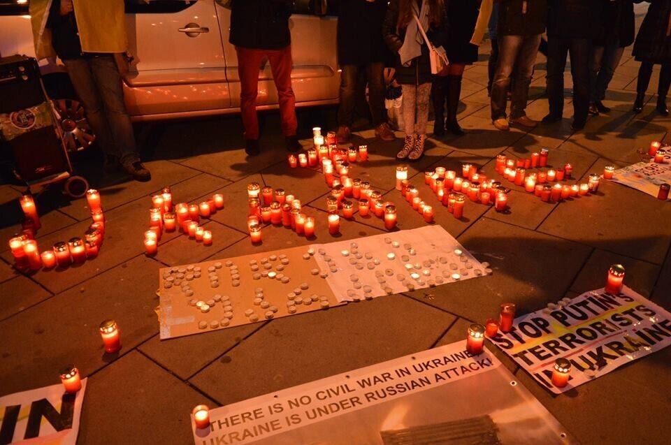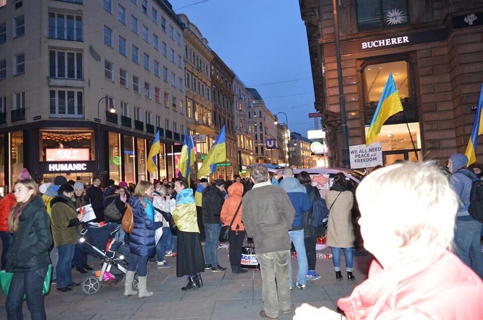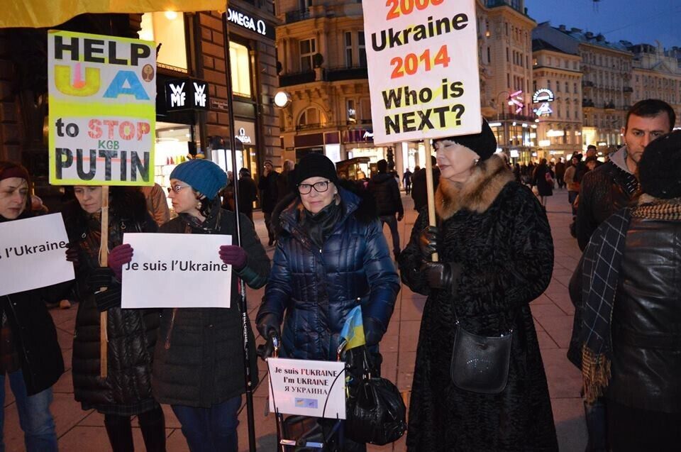 В австрийской столице провели акцию солидарности с Украиной "Ich bin Ukraine". Об этом сообщается в группе "Украинцы в Австрии" в Facebook. Участники держали в руках украинские флаги, плакаты "Путин, убирайся из Украины", "Помогите Украине остановить Путина", "Нам нужен мир и свобода", "Путин – террорист № 1", "Я Волноваха". Позже они зажгли свечи. В акции принял участие посол Украины Александр Щерба.