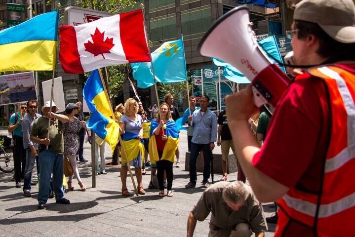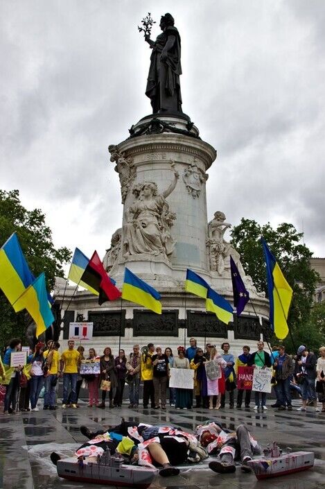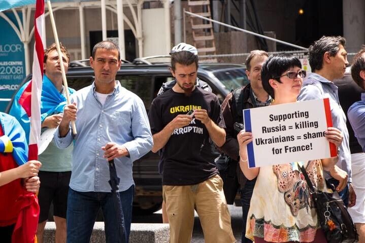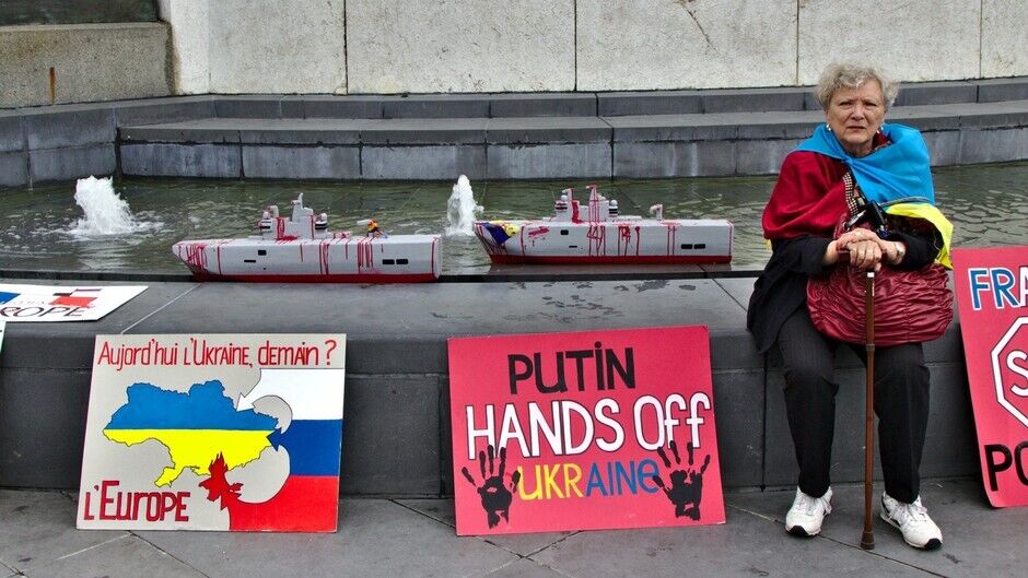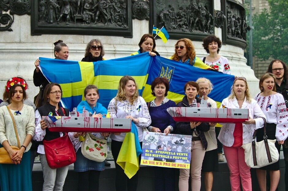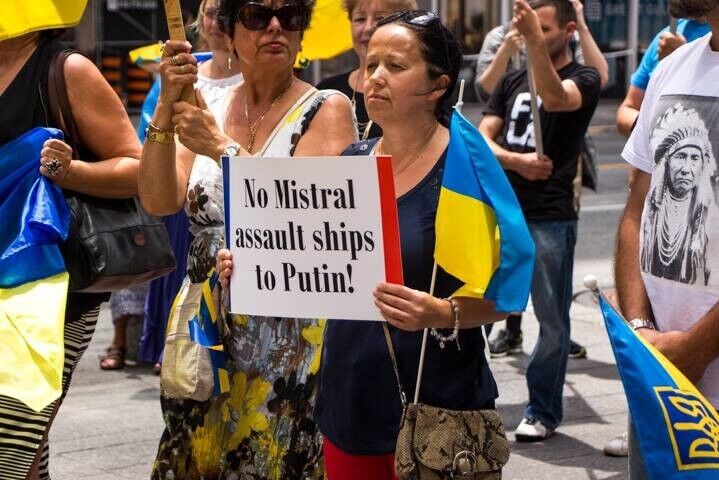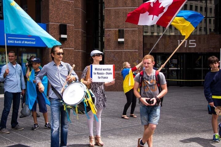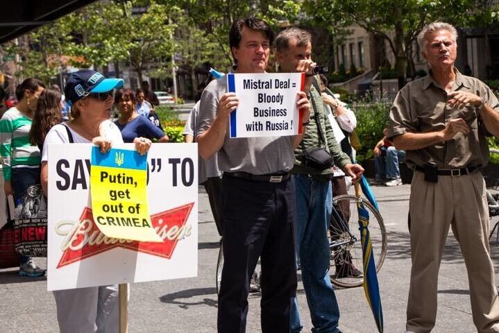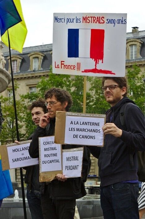 В воскресенье, 13 июля, в столице Франции Париже и в канадском городе Торонто прошли акции протеста против продажи Францией России двух десантно-вертолетных кораблей типа "Мистраль". В акциях поучаствовали по несколько десятков человек, у многих были украинские флаги и плакаты с призывом к Кремлю остановить агрессию в отношении Украины. Участники парижской акции организовали флешмоб, используя "окровавленные" модели кораблей "Мистраль". Как сообщается на странице события в Facebook, в некоторых европейских городах акции протеста пройдут сегодня.