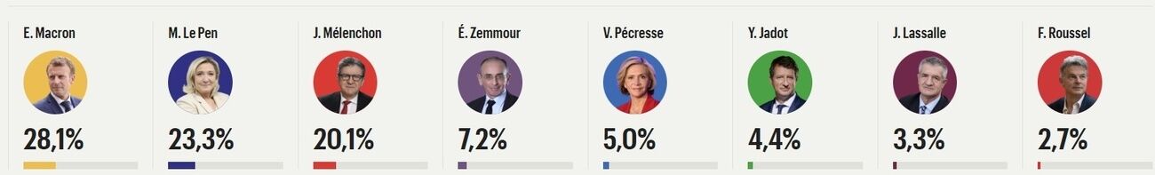 Ближайший их конкурент, журналист Жан-Люк Меланшон получил поддержку 20,1% участников экзит-полла.