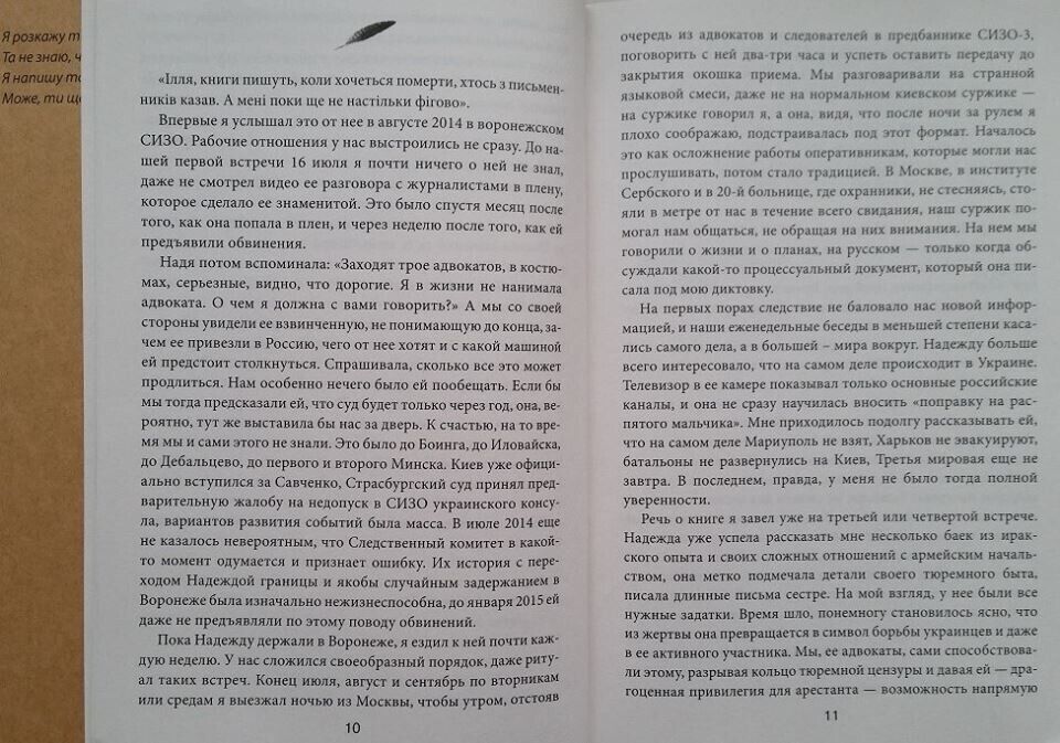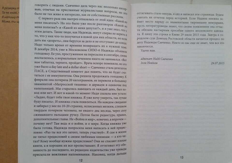 "Надя начала писать книгу, когда голодала, и закончила ее очень быстро – за две–три недели. Мы ее переносили в ушах маленькими записками, или еще где-то. В книге Надя описала войну, бой, во время которого ее похитили, плен, тюрьму, голод. Далее идет ее видение украинской армии, поступление в вуз, Ирак, контрабанда там. Финал она оставила открытым", – рассказала Вера Савченко.