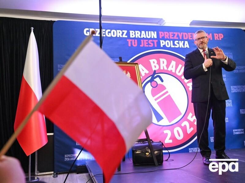 Один из соратников Брауна поднялся по лестнице к балкону ратуши, снял украинский флаг и передал его кандидату, который пожал ему руку в знак благодарности. Затем в том же месте поставили польский флаг.
