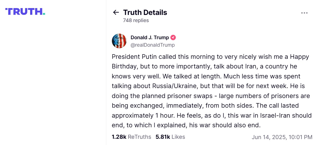 "Путин позвонил сегодня утром [по американскому времени], чтобы очень мило поздравить меня с днем рождения, но, что более важно, поговорить об Иране, стране, которую он очень хорошо знает", – написал глава Белого дома.
