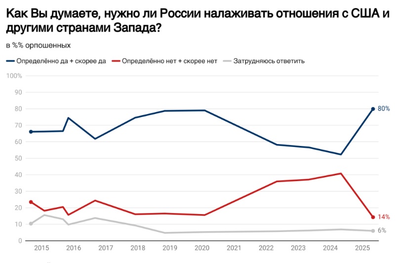 Авторы материала отмечают, что доля тех, кто против налаживания отношений с Западом, – 14% – минимальная за все время исследований.
