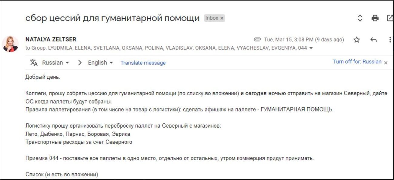 Расследователи также опубликовали скриншоты переписки по корпоративной почте российской сети "Ашан", где обсуждается сбор паллетов "гуманитарной помощи". При этом, как отмечает The Insider, в перечне товаров этой "помощи" не было ничего для женщин и детей, но были бритвы и сигареты, а также тушенка, зубная паста и стиральный порошок.