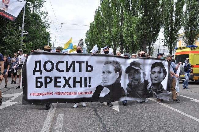 Около тысячи человек 4 июля прошли маршем от киевского парка Шевченко к Министерству внутренних дел и Офису президента, требуя освободить подозреваемых в убийстве журналиста Павла Шеремета. Об этом сообщает "Радіо Свобода". Акция называлась "200 дней лжи" – именно столько времени Андрей Антоненко, Яна Дугарь и Юлия Кузьменко находятся под следствием. Во время марша участники выкрикивали "Свободу политзаключенным!" и "Хватит лжи". "Цензор.НЕТ" пишет, что сотрудники полиции выставили коридор на входах на улицу Банковую и проверяли людей на наличие запрещенных предметов и спецсредств. Под ОПУ демонстранты зажгли файеры. Они призвали общественность обратить внимание на сфабрикованное, по их мнению, обвинение против Антоненко, Дугарь и Кузьменко, попросив поддержать их на судебных заседаниях.
