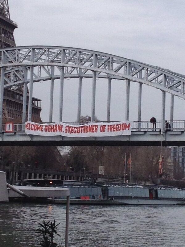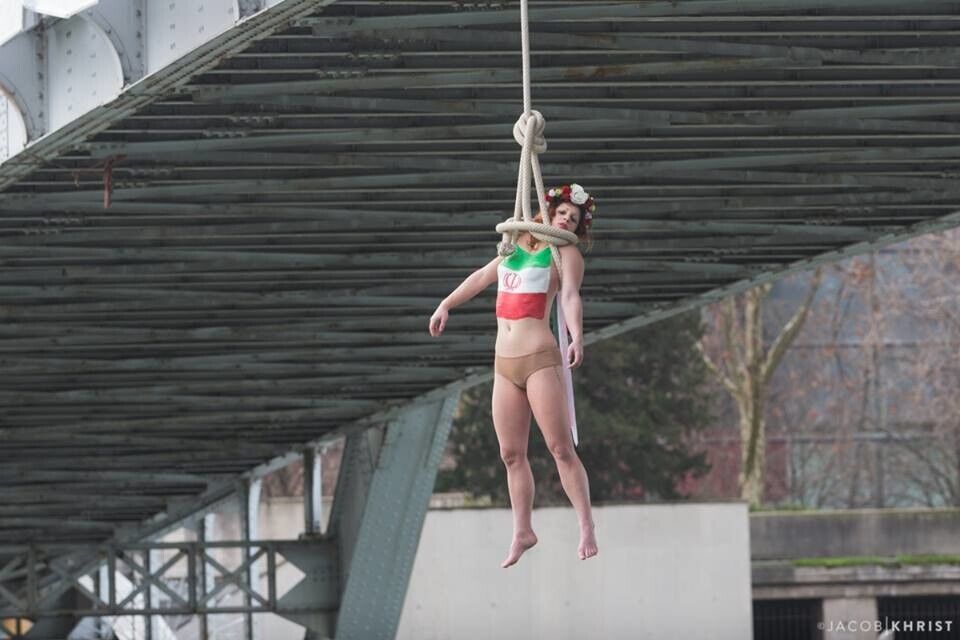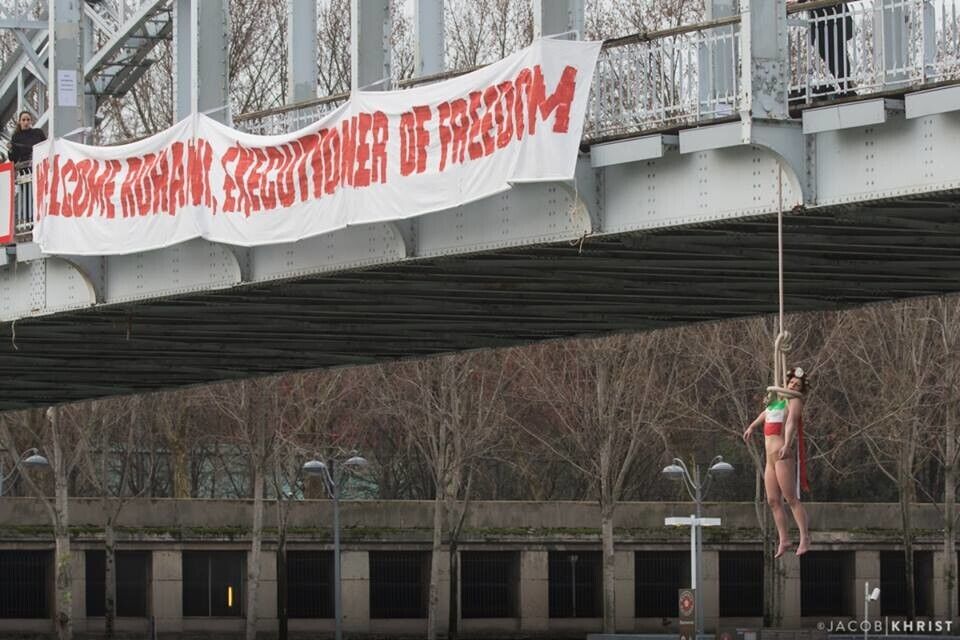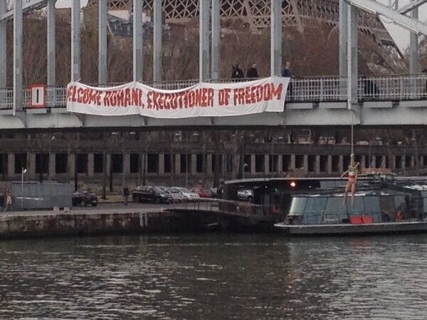 В Париже одна из активисток движения Femen сымитировала повешение под мостом в знак протеста против визита президента Ирана Хасана Рухани во французскую столицу. По данным пресс-службы организации, повисшая под мостом активистка с иранским флагом, нарисованным на груди, имитировала казнь. В Femen подчеркнули, что такой жест избран в знак протеста против распространенной в Иране казни "женщин, феминисток и вольнодумцев".