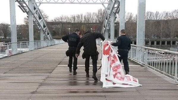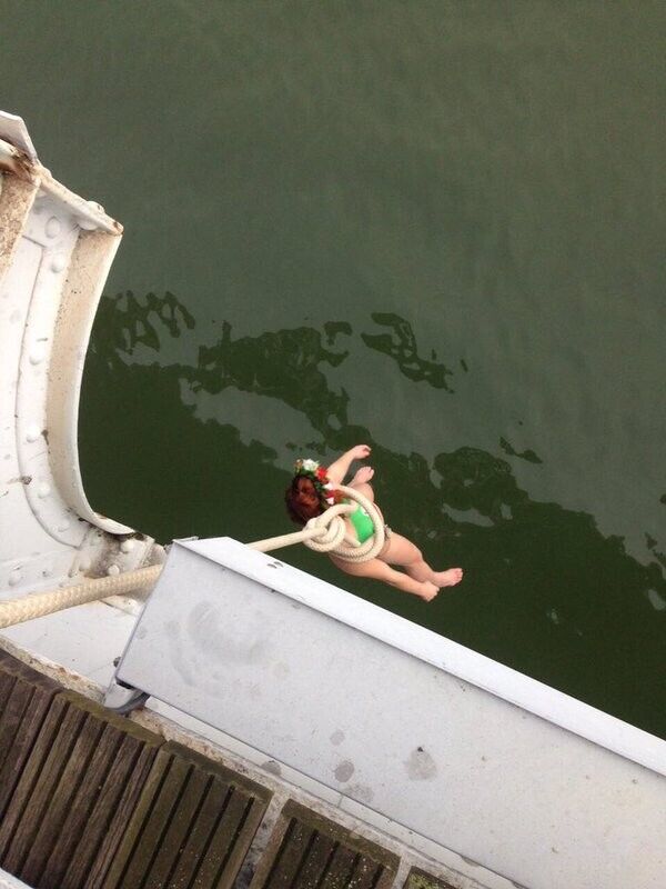 Активистка Femen повисла под парижским мостом в знак протеста против приезда Рухани. Фоторепортаж